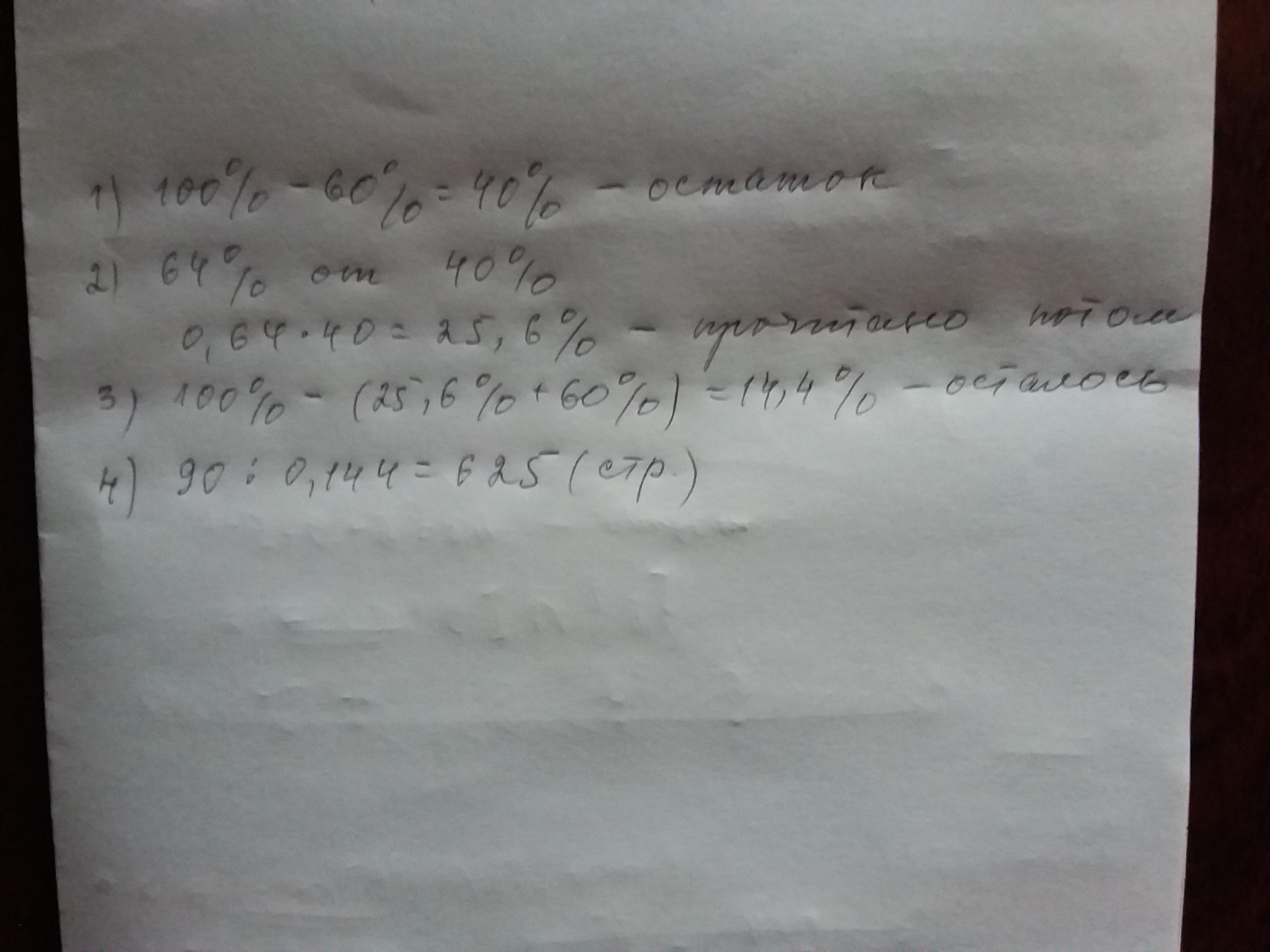 Сначала Витя прочитал 60% всей книги, а потом 64% остатка, Сколько страниц в книге, если Вите осталось прочитать 90 страниц?