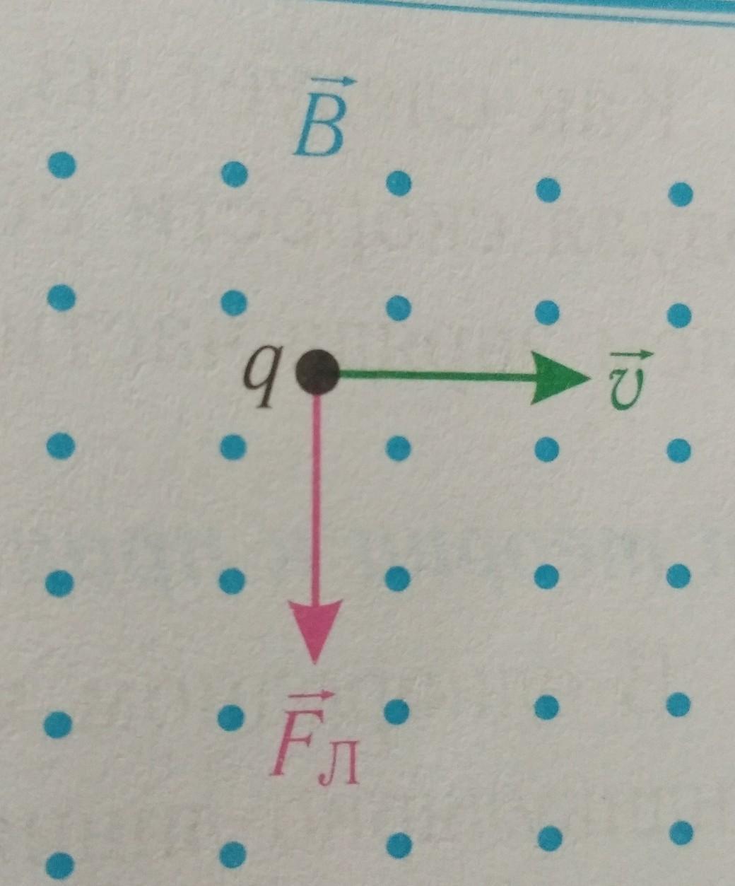 На рисунке представлены направления индукции магнитного поля, скорости движения частицы в данный момент времени и сила Лоренца, действующей на частицу со стороны магнитного поля. Определите знак заряда частицы