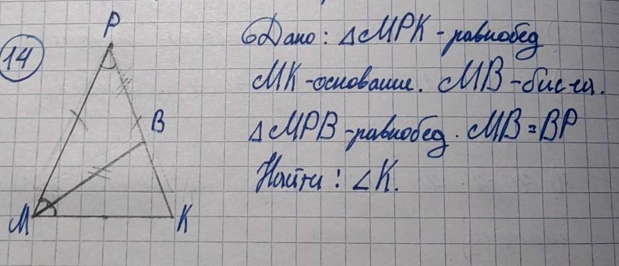 треугольник MPK равнобедренный(т.к. подобен треугольнику MBP ) следовательно угол MBK и MBP равен (180-102):2=39, так как MB и RB бисектриссы то угол NMR и MRN равны 39*2=78,следовательно угол МNR =180 -78*2=24
