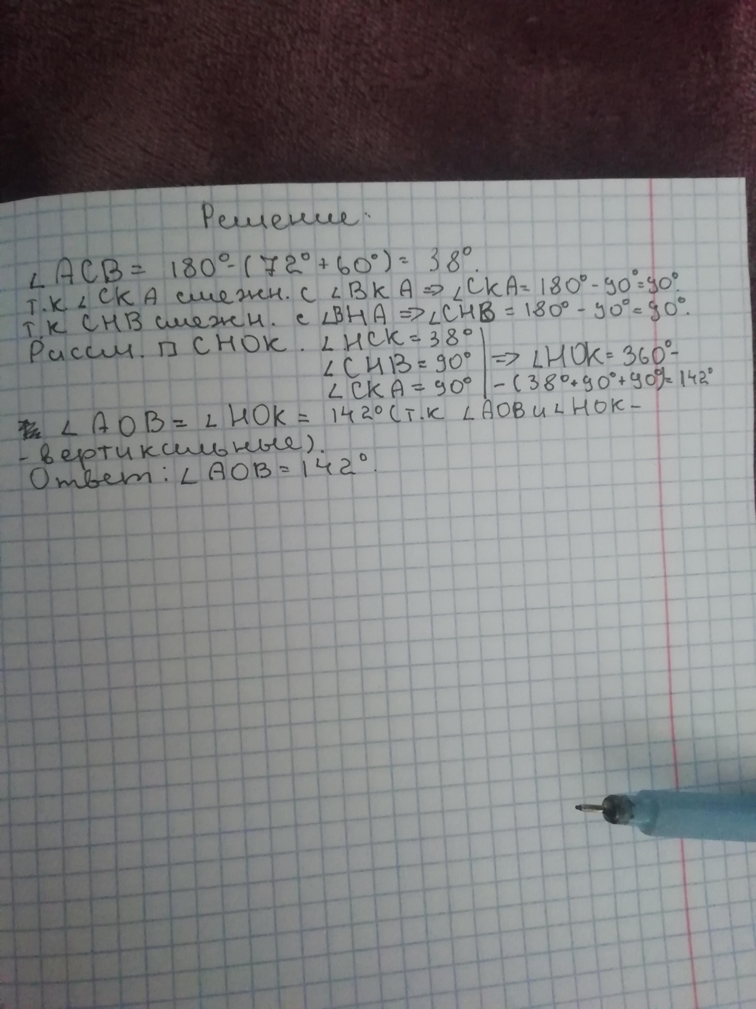 Так, там не верно, угол АСВ=48. Там везде 38 на 48 нужно исправить и в итоге угол АОВ=132.