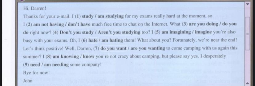 Hi, Darren! Thanks for your e-mail. I (1) study / am studying for my exams really hard at the moment, so I (2) am not having / don't have much free time to chat on the Internet. What (3) are you doing / do you do right now? (4) Don't you study too / Aren't you studying too? I (5) am imagining / imagine you're also busy with your exams. Oh, I (6) hate / am hating them! What about you? Fortunately, we're near the end! Let's think positive! Well, Darren, (7) do you want / are you wanting to come camping with us again this summer? I (8) am knowing / know you're not crazy about camping, but please say yes. I desperately (9) need / am needing some company! Bye for now! John