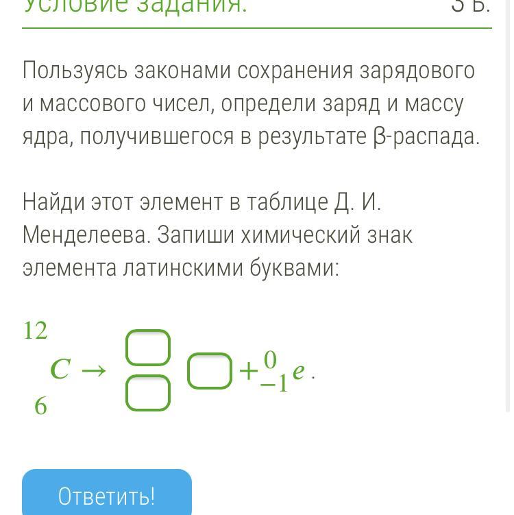 Найди этот элемент в таблице Д. И. Менделеева. Запиши химический знак элемента латинскими буквами: