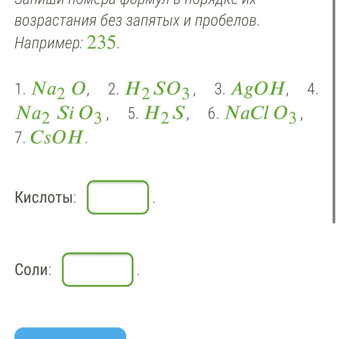 Приведены формулы веществ. Выбери среди них формулы кислот и солей.