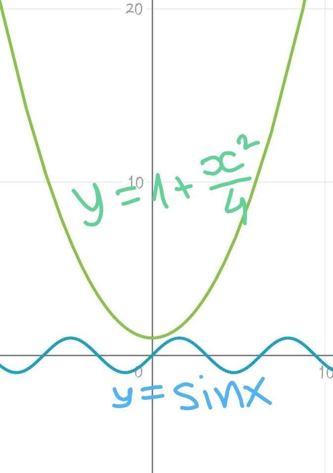 f(x) = sinx находятся ниже g(x)= 1 + x^2/4
