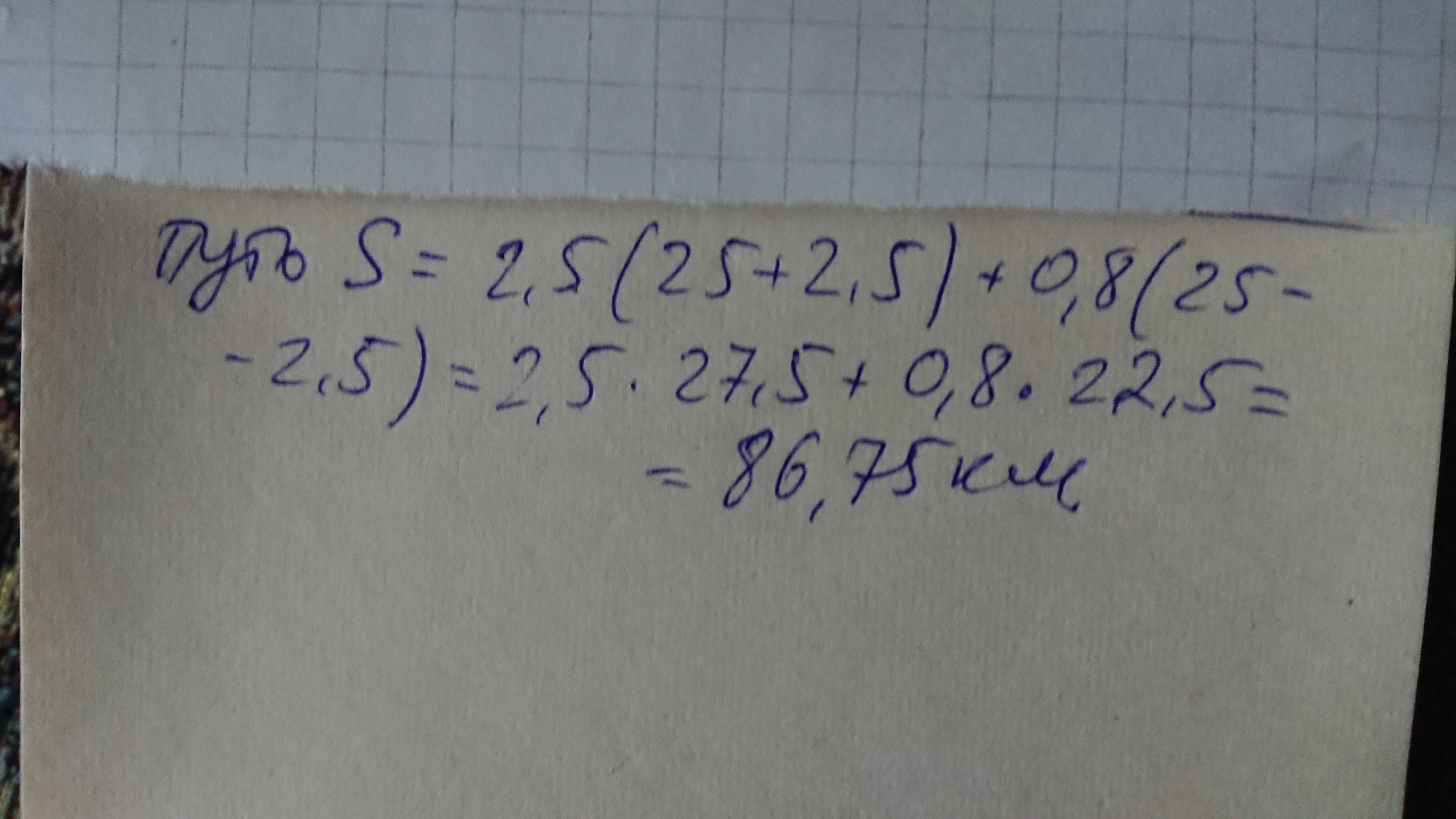 Катер плыл по течению 2,5 ч а против течения 0,8 ч какой путь преодолел катер за всё это время если собственная скорость катера 25 км/ч а скорость течения 2,5 км/ч