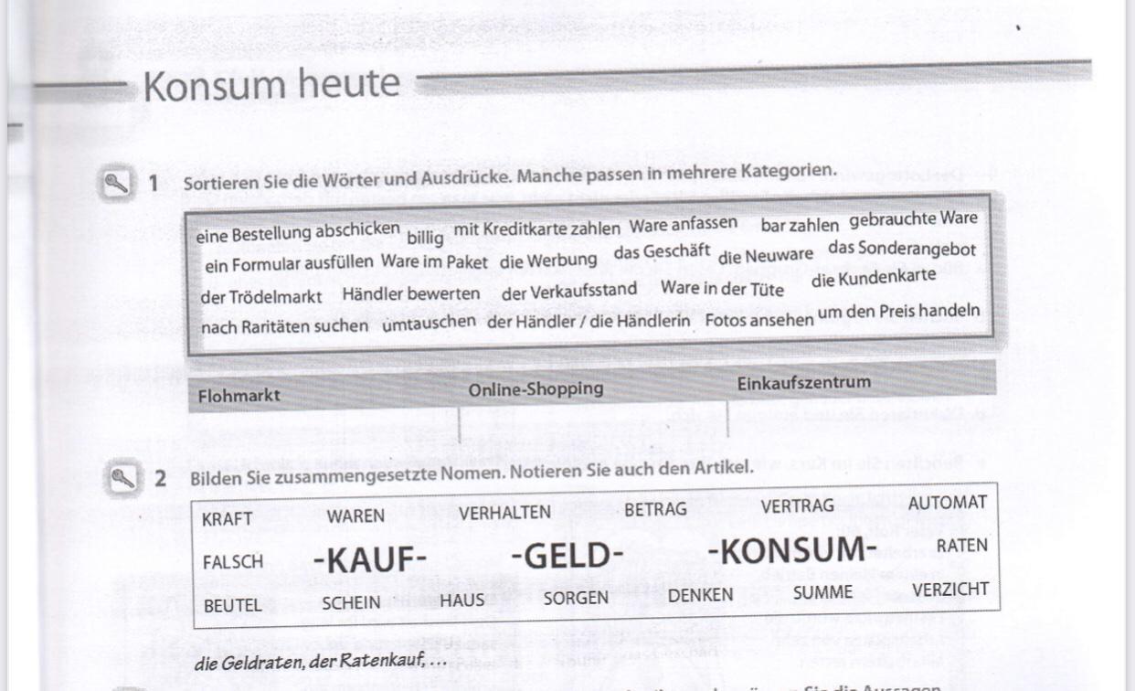 eine Bestellung abschicken, billig, mit Kreditkarte zahlen, gebrauchte Ware, ein Formular ausfüllen, Ware im Paket, die Werbung, die Neuware, das Sonderangebot, Händler bewerten, die Kundenkarte, nach Raritäten suchen, umtauschen, Fotos ansehen