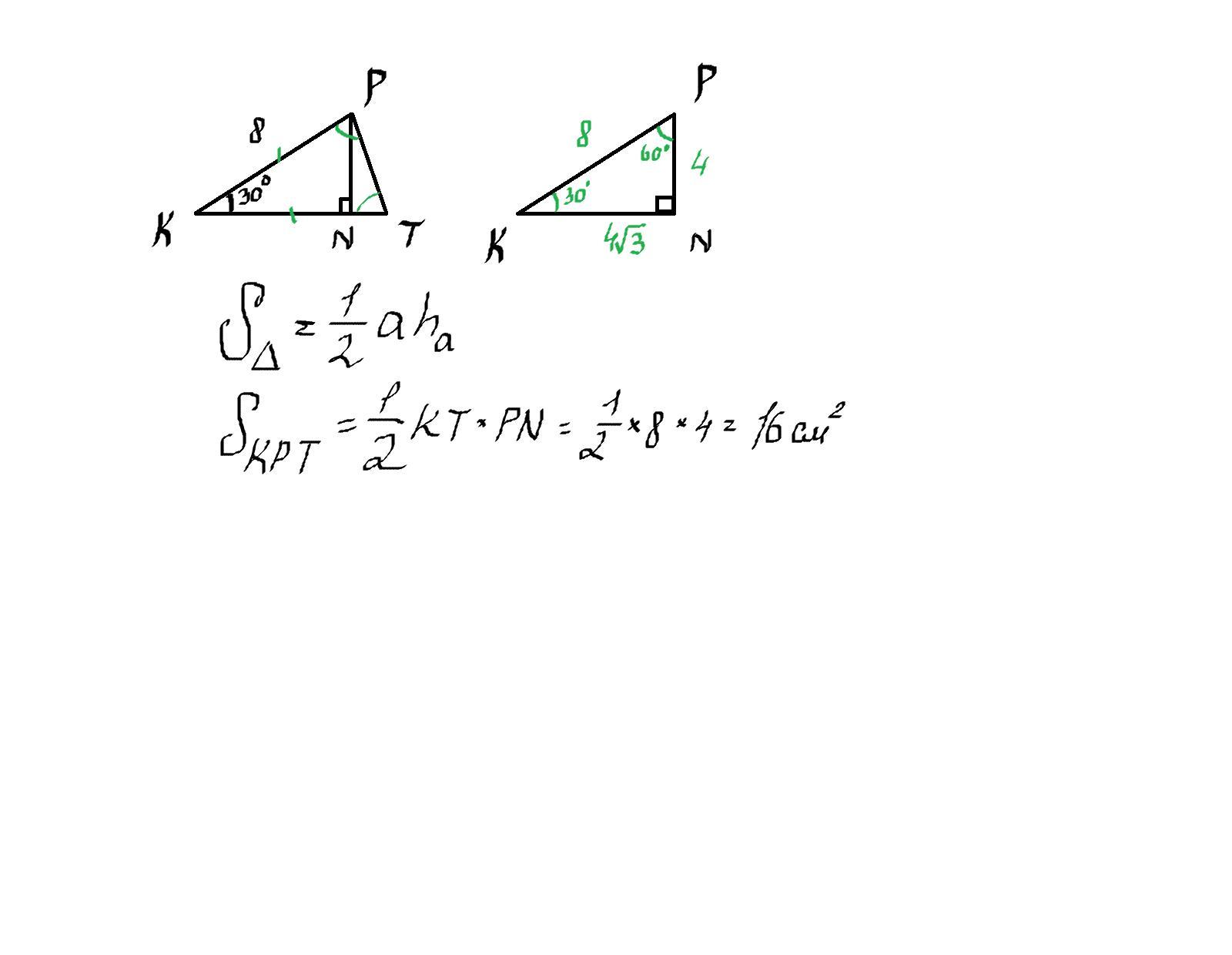 Определи площадь треугольника KPT, если KT = 8 см, ∡K=30°, ∡P=75°.