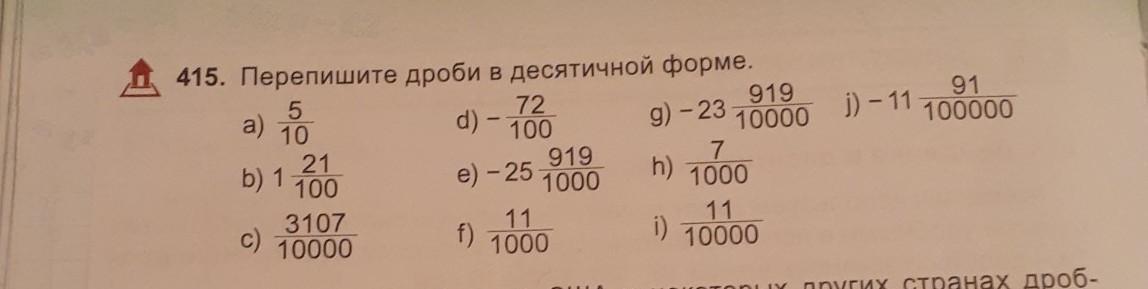 Перепишите дроби в десятичной форме a)5/10 b)1 21/100 c)3107/10000 d)- 72/100 e)-25 919/1000 f)11/1000 g)-23 919/10000 h)7/1000 i)11/10000 j)-11 91/100000