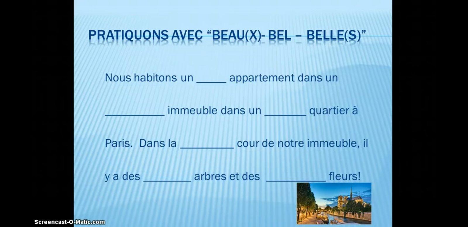 1) beau 2) beau 3) beau 4) belle 5) bel 5) belles