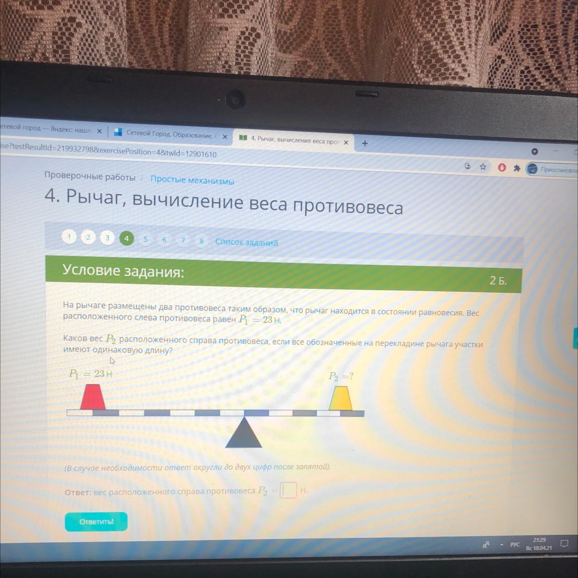 На рычаге размещены два противовеса таким образом , что рычаг находится в состоянии равновесия. Вес расположенного слева противовеса равно Р1 = 23 Н.
