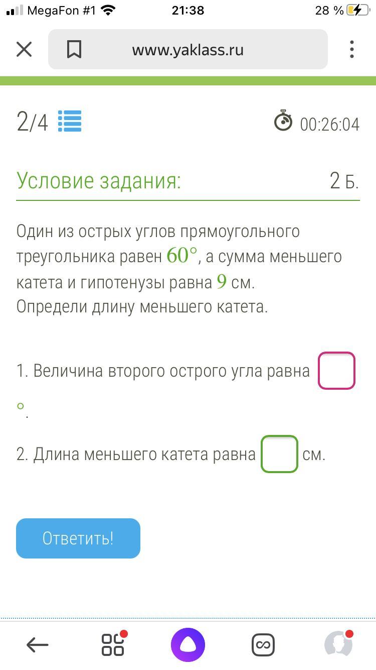 Величина второго угла равно 90-60=30( по первому свойству прямоугольного треугольника)