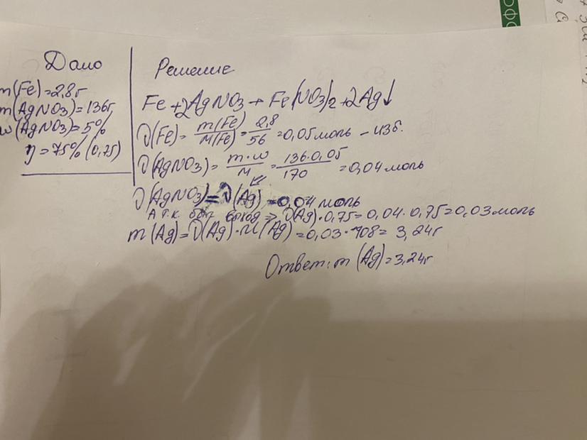 железо массой 2,8г внесли в раствор нитрата серебра(1) массой 136г с массовой долей соли равной 5%. Рассчитать массу (г) метала, который выделился в итоге реакции, когда выход продукта составляет 75%.