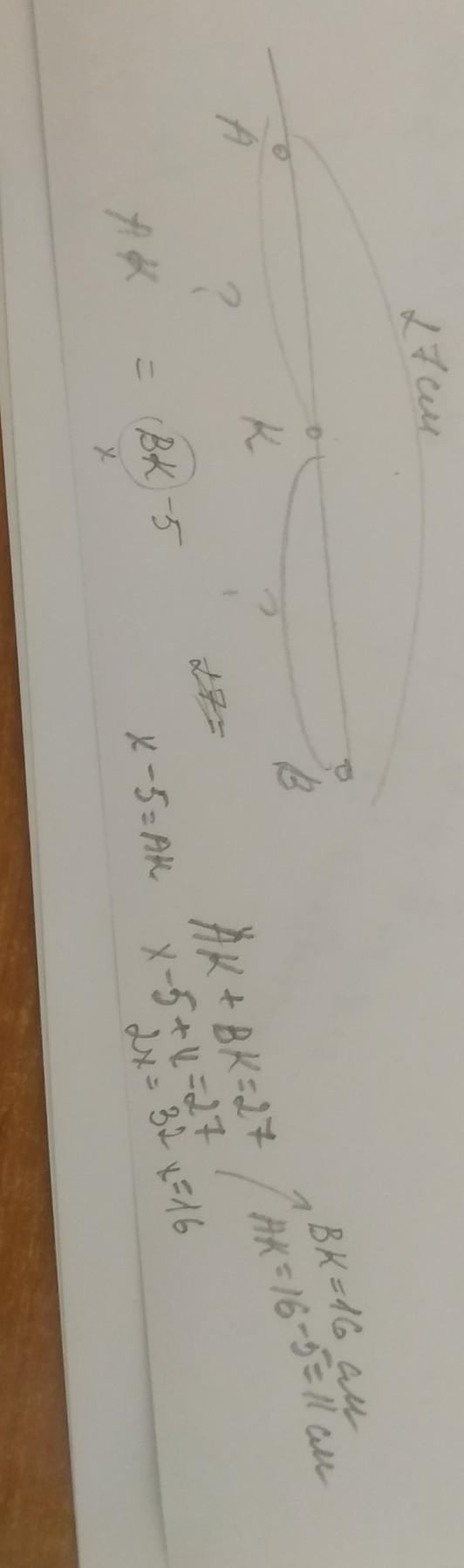 точка K належить відрізку AB довжина якого 27 см.Знайдіть довжини відрізків AK і BK якщо AK меншиц від BK на 5 см