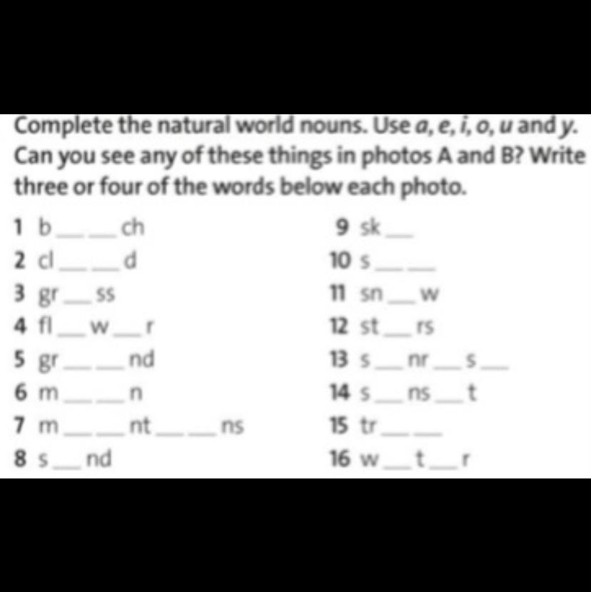 1.Beach 2.cloud 3.grass 4.flower 5.ground 6.moon 7.mountains 8.sand 9.ski 10.sun 11.snow 12.stars 13.sunrise 14.sunset 15.tree 16.water