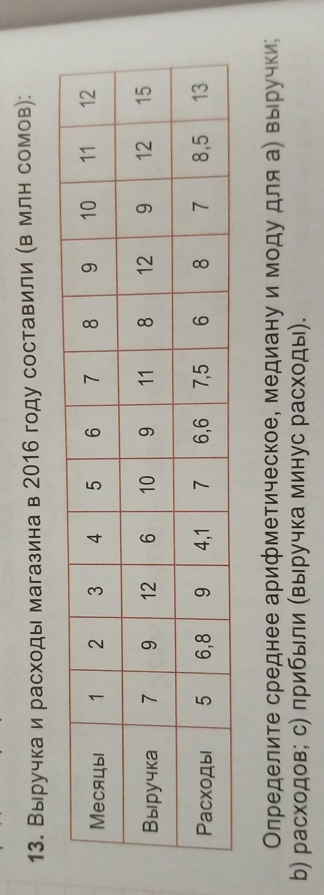 Выручка: ср.ариф= (7+9+12+6+10+9+11+8+12+9+12+15)/2= 60