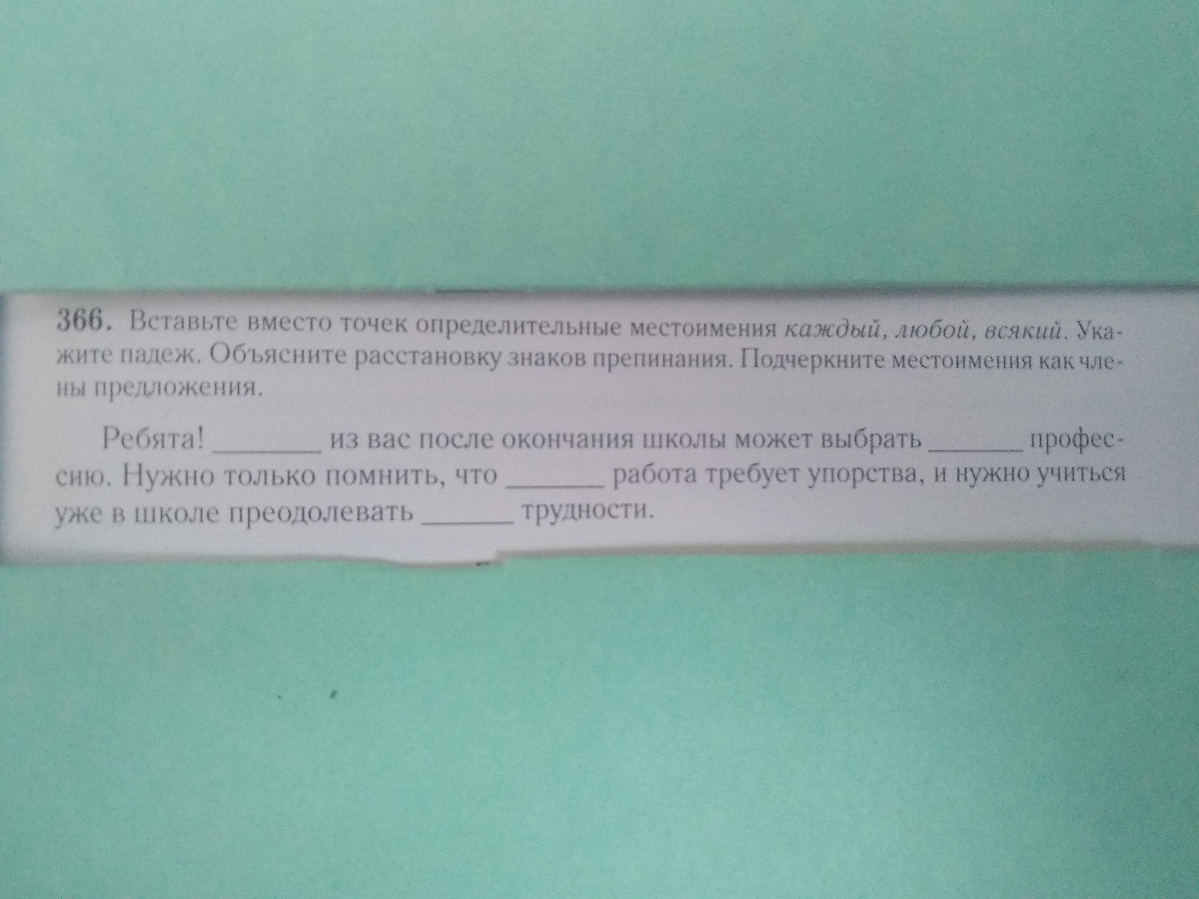 Ребята! Каждый (им.п) из вас после окончания школы может выбрать любую(в.п) профессию.Нужно только помнить , что всякая (д.п.) работа требует упорства, и нужно учиться уже в школе преодолевать любые(в.п) трудности.