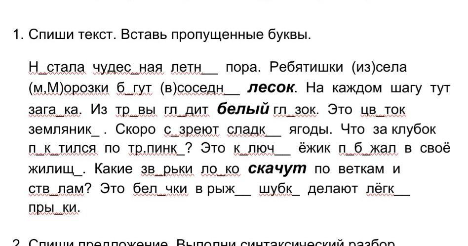 Настала чудесная летняя пора. Ребятишки из села Морозки бегут в соседний лесок. На каждом шагу тут загадка. Из травы глядит белый глазок. Это цветок земляники. Скоро созреют сладкие ягоды. Что за клубок покатился по тропинке? Это колючий ёжик побежал в свое жилище. Какие зверьки ловко скачут по веткам и стволам? Это белочки в рыжих шубках делают легкие прыжки.