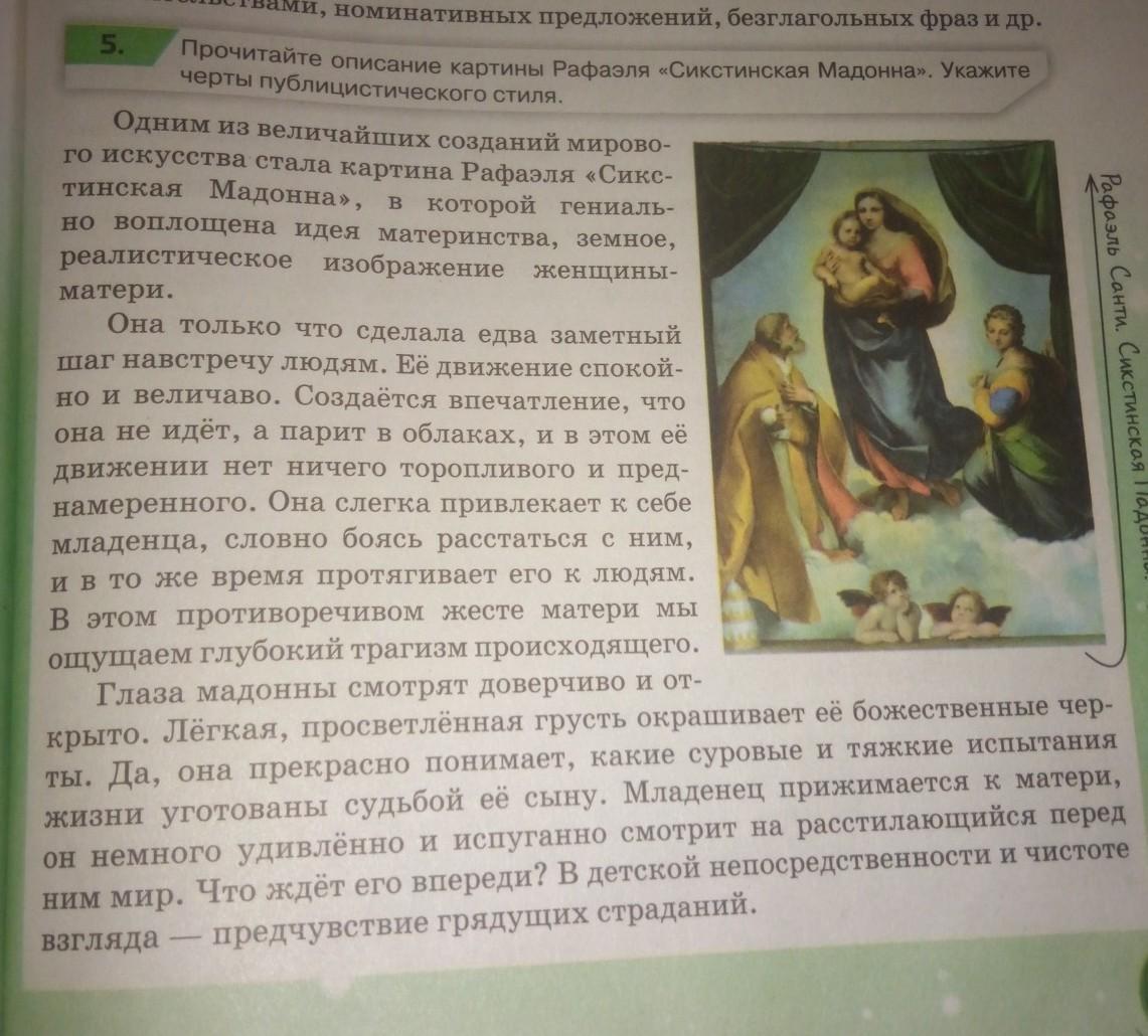 эмоциональность и образность речи – для создания необходимой атмосферы: "глаза мадонны смотрят доверчиво и открыто", "просветленная грусть окрашивает", "немного удивленно и испуганно смотрит", "детская непосредственность и чистота взгляда", " нежной женственности и царского величия".