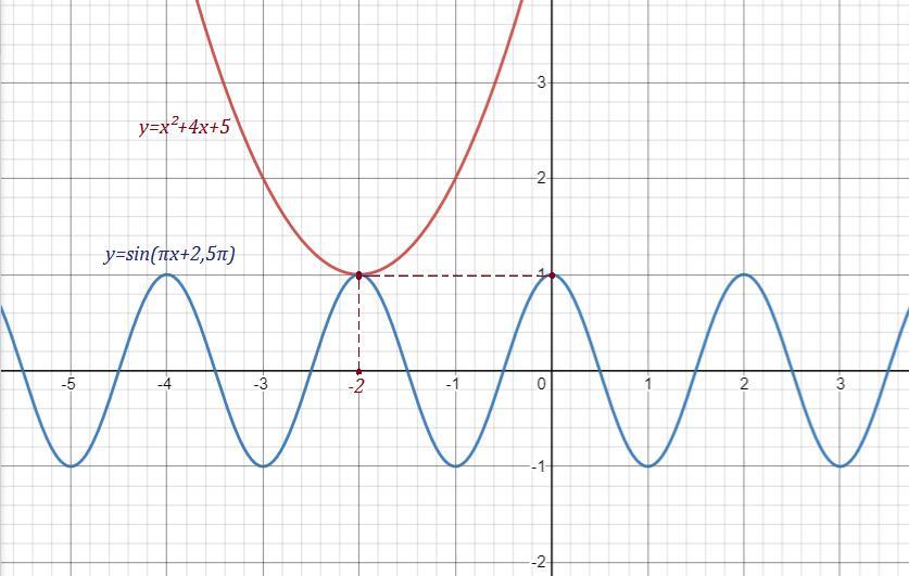 Эти графики имеют одну общую точку при х= -2 . При всех других значениях переменной х график синуса лежит ниже (а не выше) параболы. Поэтому только одна точка удовлетворяет заданному неравенству, это х= -2 .