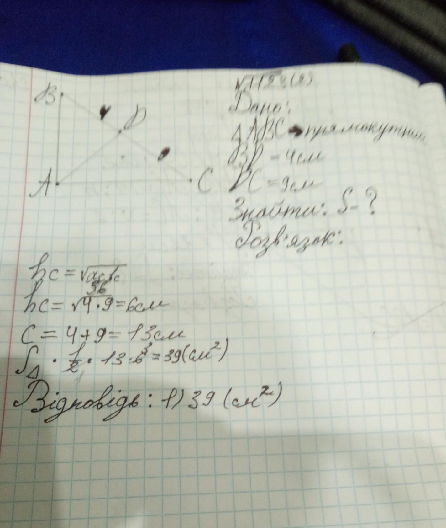 Знайдіть площу прямокутного трикутника, якщо його висота ділить гіпотенузу на відрізки 4 см і 9 см.