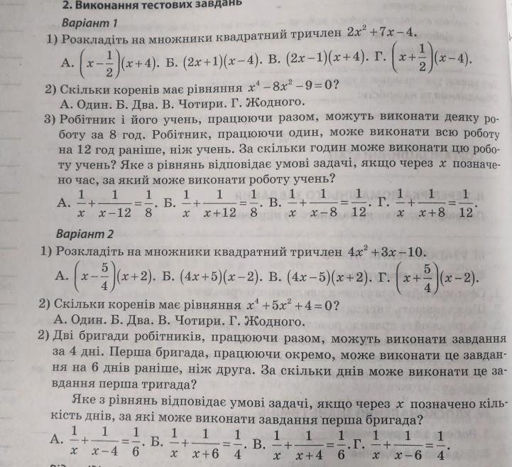 вариант 2 задание №1 ответ—В) (4х-5)(х+2) задание №2 ответ нет решения ответ Г