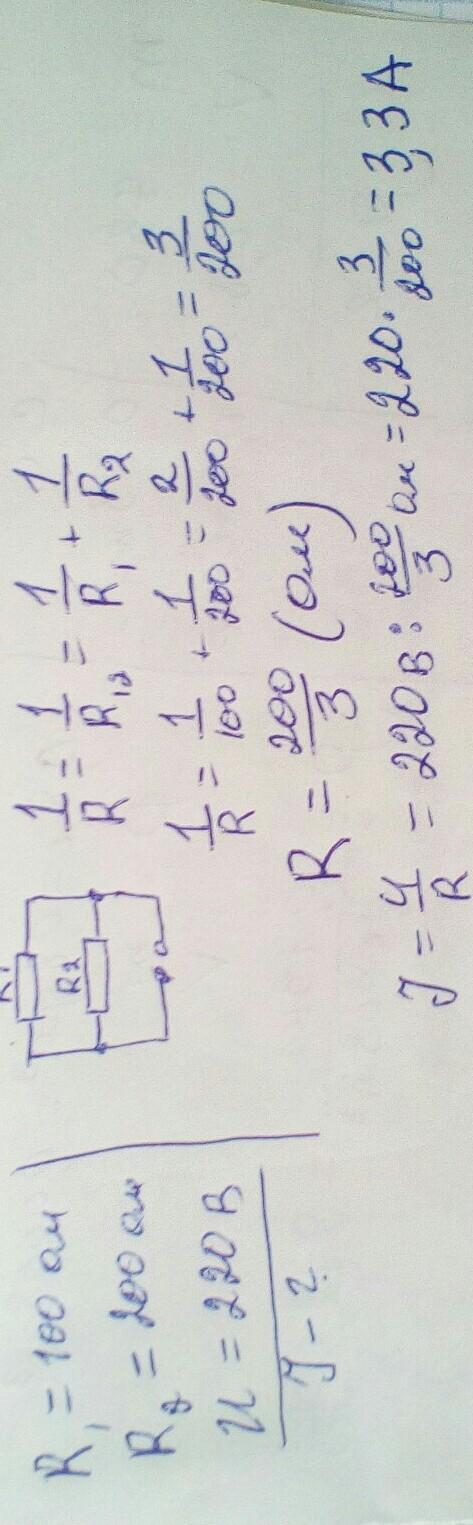 Два резистора сопротивлением 100 Ом и 200 Ом,соединены параллельно.Определить силу тока в цепи,если напряжение в нём 220 В.