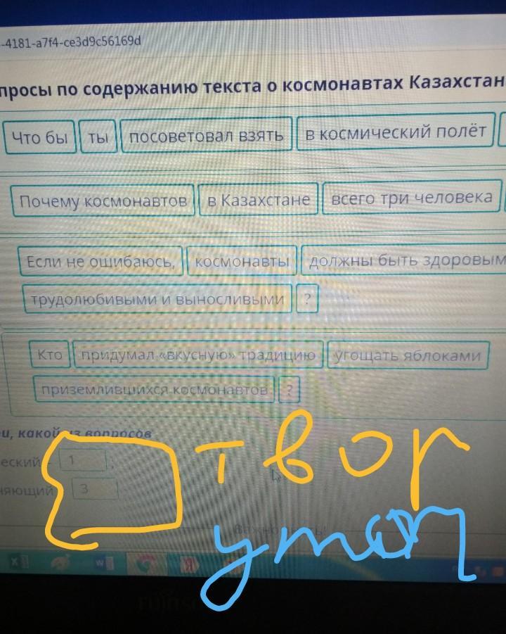 Составь вопросы по содержанию текста о космонавтах Казахстана. Чтобы ты посоветовал взять в космический полёт ? Почему космонавтов в Казахстане всего три человека ? Если не ошибаюсь, трудолюбивыми и выносливыми космонавты должны быть здоровыми, ? Кто придумал «вкусную» традицию угощать яблоками приземлившихся космонавтов ? Выбери, какой из вопросов творческий – ; уточняющий – .