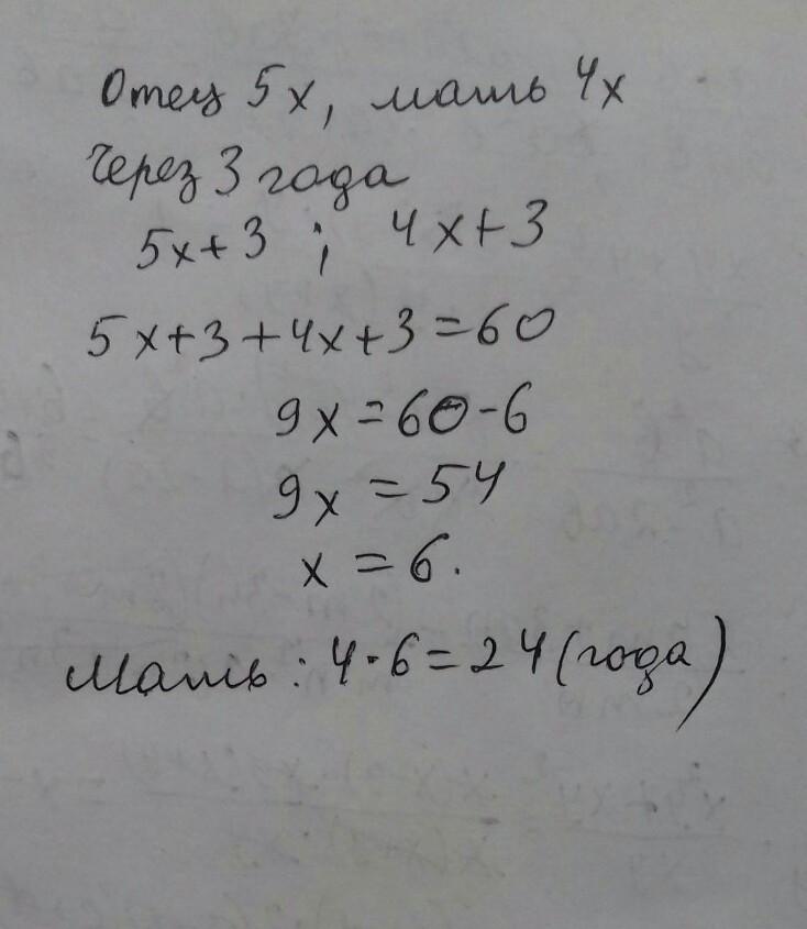 Отношение возрастов отца к матери 5:4. Сумма их возрастов через 3 года будет 60. Сколько лет матери сейчас? Ответ запишите только цифрой.