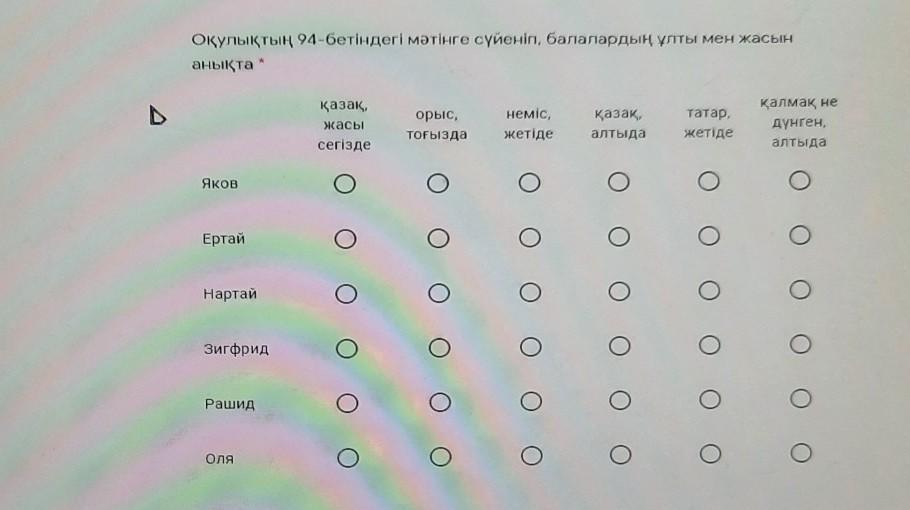 Оқулықтың 94-бетіндегі мәтінге сүйеніп, балалардың ұлты мен жасын