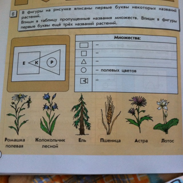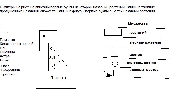 Впиши в таблицу пропущенные названия множеств. Выпиши в фигуры первые букв еще трех названий растений.у