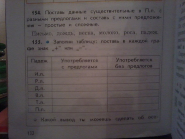 заполни таблицу поставь в каждой графе знак "+" или "-" (добавь предлоги)