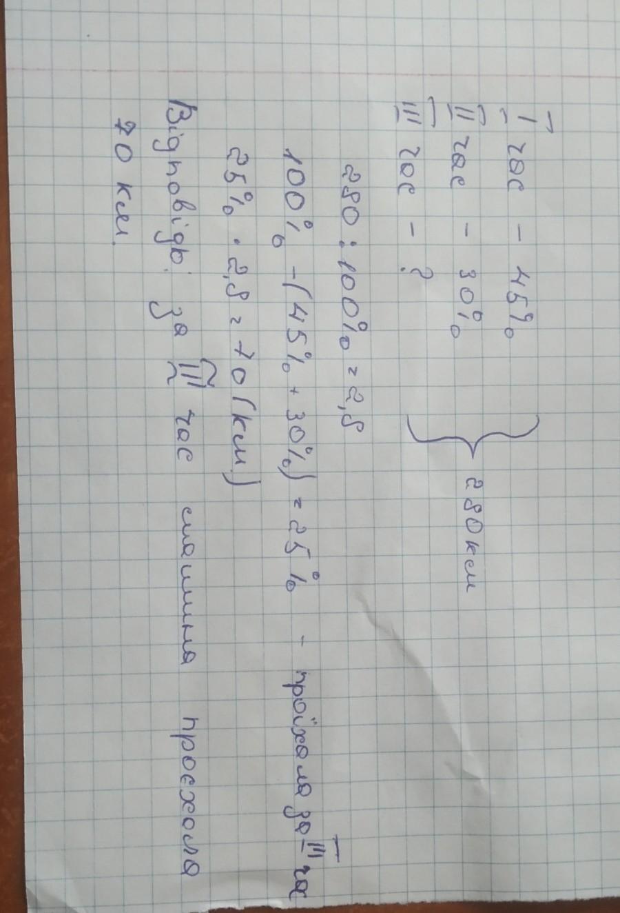 Сначало узнаём сколько она приехала километров за один процент, потом сколько процентов за 3 час, ну а потом сколько получилось процентов за 3 час умножаем на то сколько получилось в одном проценте.