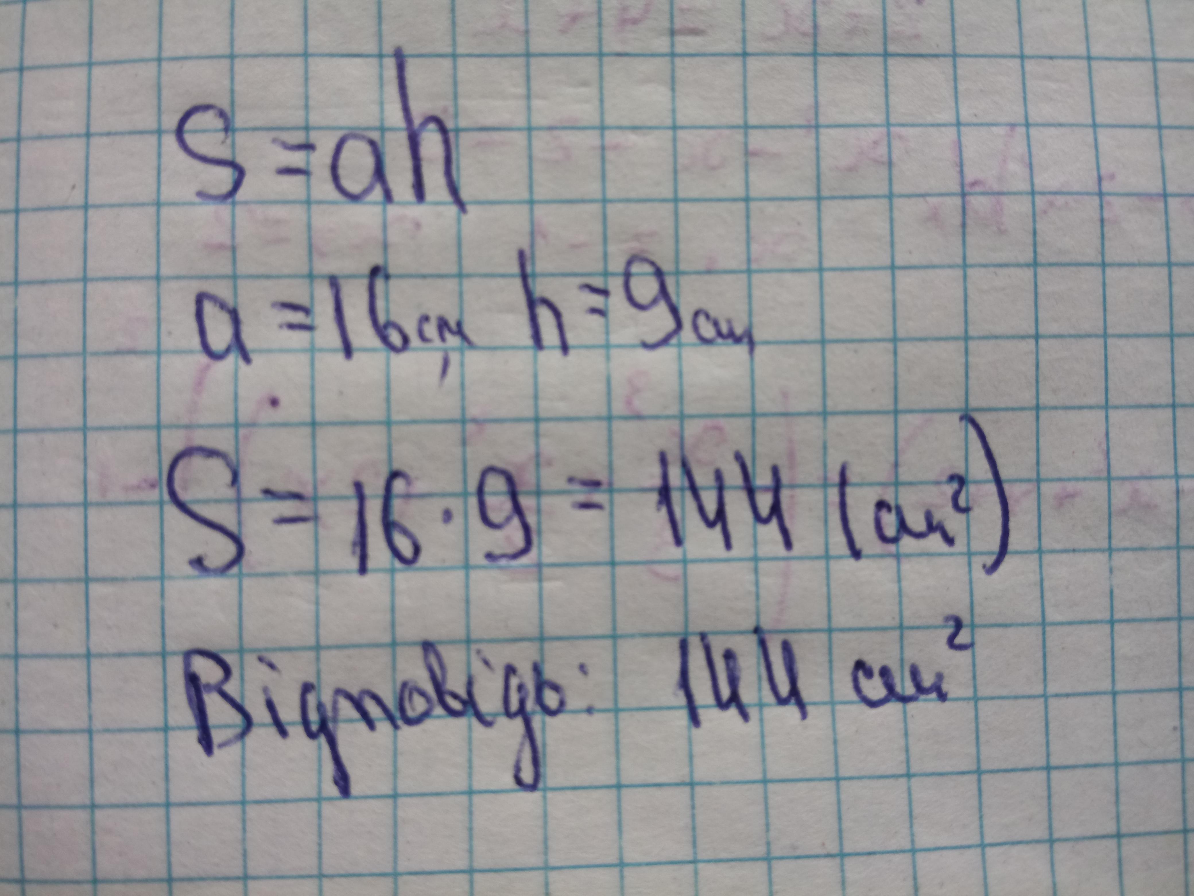 Знайдіть площу паралелограма, сторона якого дорівнює 16 см, а висота, проведена до неї - 9 см. Пж полное решение