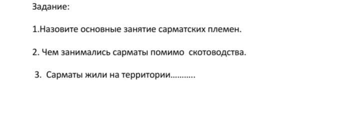 Основные занятия сарматов-это разведение скота,войны за новые пастбища,сельское хозяйство,в меньшей степени. Домашние ремёсла-кузнечное, , кожевенное вышивание, ткачество, гончарство. Создавали изделия и украшения из бронзы,активно занимались торговлей с греками.
