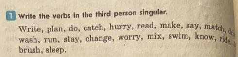 writes, plans, does, catches, hurries, reads, makes, says, matches, drinks, washes, runs, stays, changes, worries, mixes, swimmes, knows, rides, brushes, sleeps