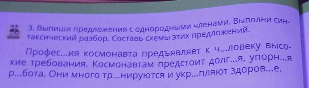 Космонавтам- подлежащее, предстоит- сказуемое, долгая- прилагательное, упорная- наречие, работа- дополнение.