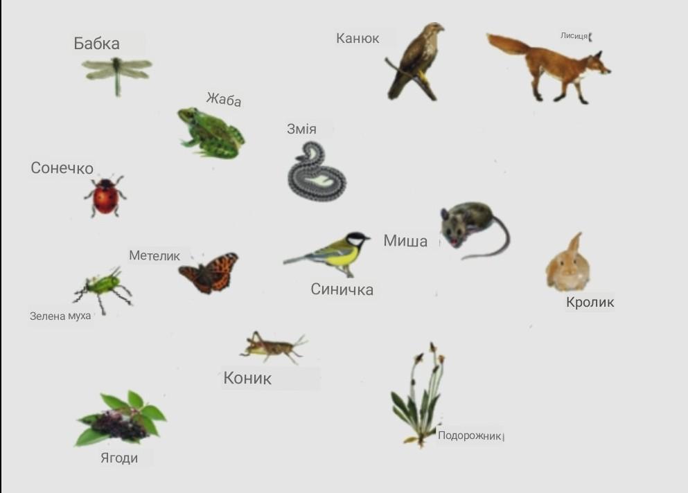 розгляньте малюнок і визнач між якими організмами зображеними на ньому виникають зв'язки. З'єднай ці організми стрілками у напрямку від хижака до жертви!