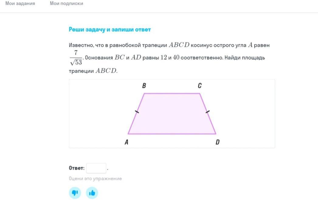 Опустим высоту BH. Получили прямоугольный треугольник BHA (∠ BHA = 90°). Так как косинус - это отношение прилежащего угла к гипотенузе, получаем, что AH = 7, AB = .