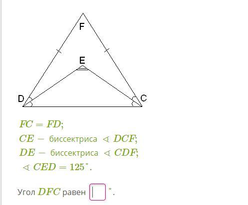 Отсюда следует что угол FDC= 180- угол FCD -угол FDC= 180-55-55=70
