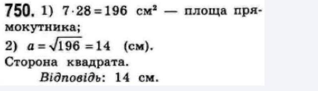 Знайдіть сторону квадрата, що має таку саму площу, як і прямокутник зі сторонами 7см 28см.