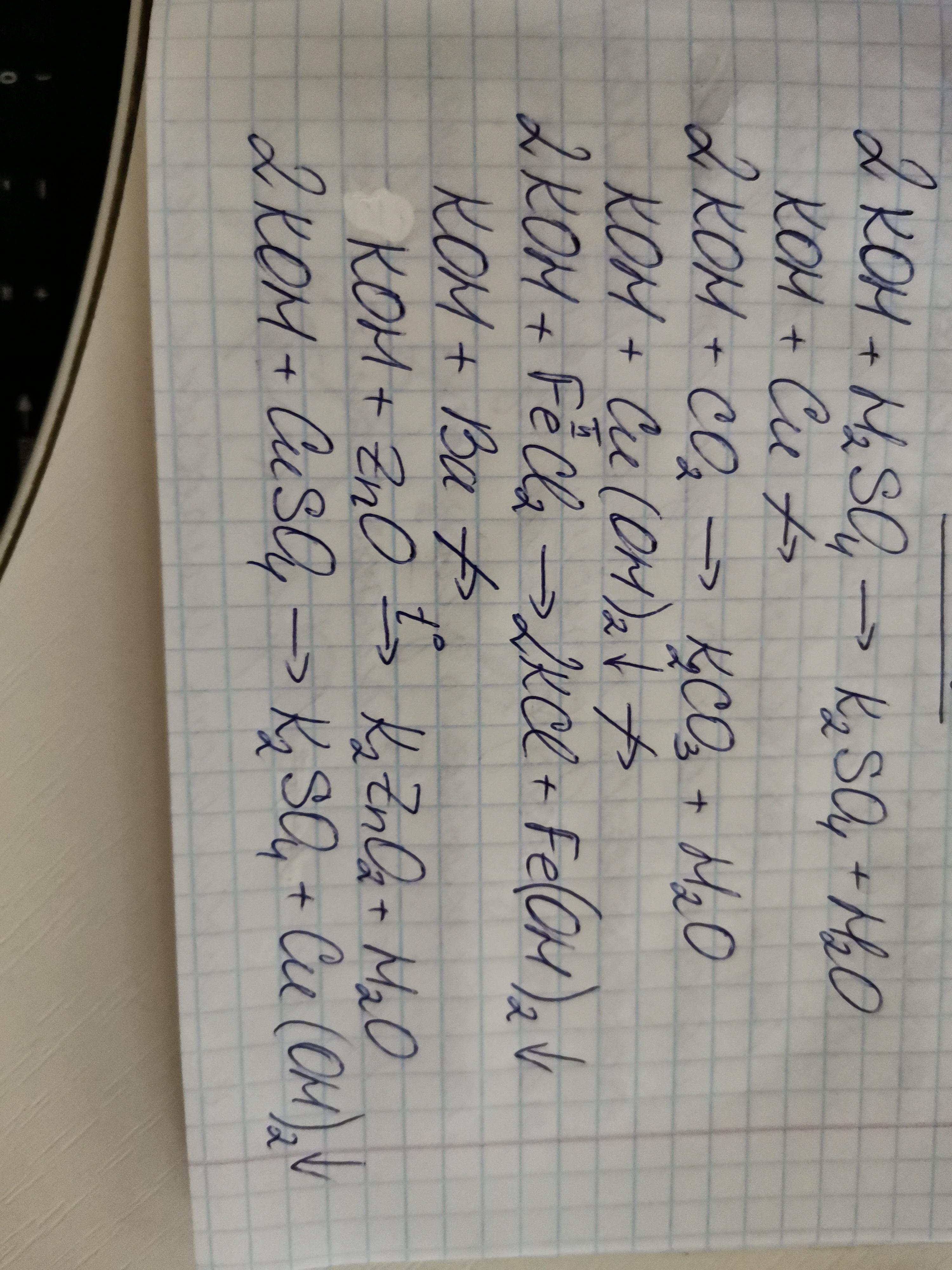 С какими из перечисленных веществ будет реагировать гидроксид калия: гидроксид калия: H2SO4, Cu, CO2, Cu(OH)2, FeCl2, Ba, ZnO, CuSO4