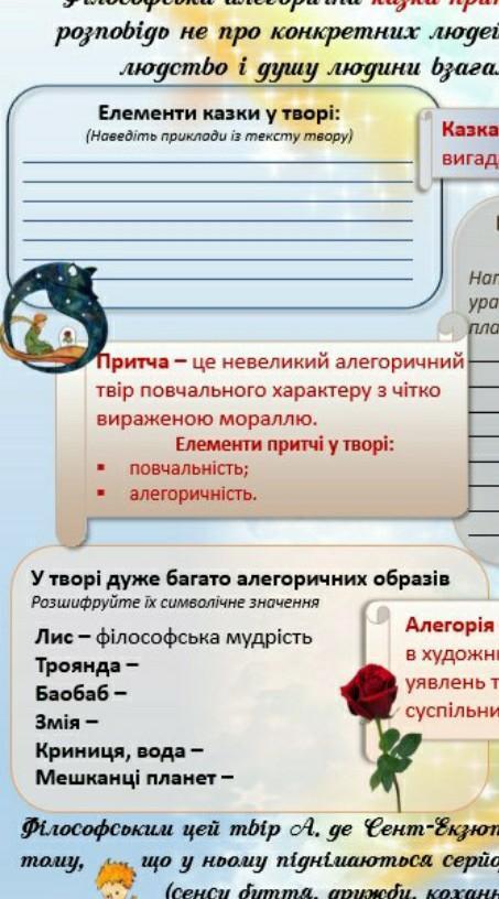Незвичний сюжет, персоніфікація рослин, тварин (Лис, Троянда, Змія) — це елементи казки. У творі багато алегорій (баобаби, вода), подаються морально— філософські роздуми письменника — це елементи притчі