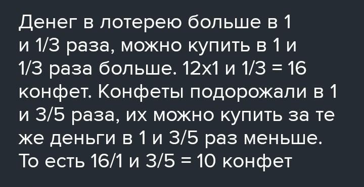 В понедельник лакомка Наташа купила 12 конфет и с большим удовольствием съела их.В четверг она выиграла в лотерею сумму денег, которая превышает потраченную ею в понедельник в 1 одну третью раза.Однако выяснилось, что цена конфет увеличилась в 1 три пятых раза.Сколько конфет сможет купить Наташа.