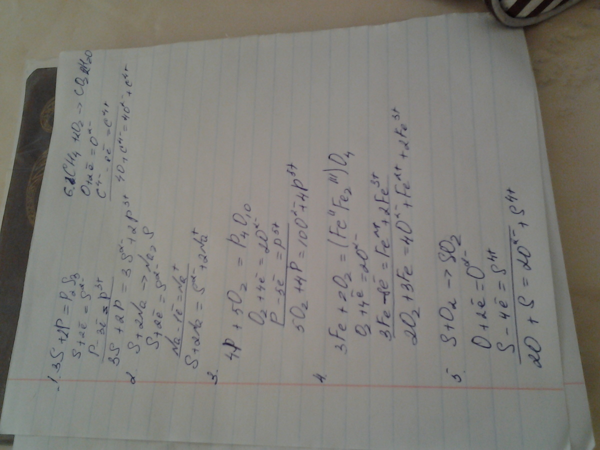 закончите следующие уравнения реакций,составив схемы электронного баланса к каждому уравнению:S+P=?,S+NA=?,P+O2=?,Fe+O2=?,CH4+O2=?,S+O2=?.