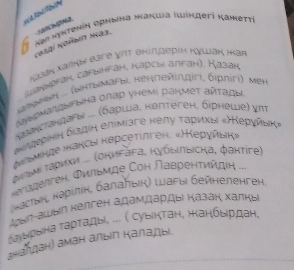 1)қарсы алған,2)кеңпейіл 3)барша 4)оқиғаға 5)? 6)ажалдан