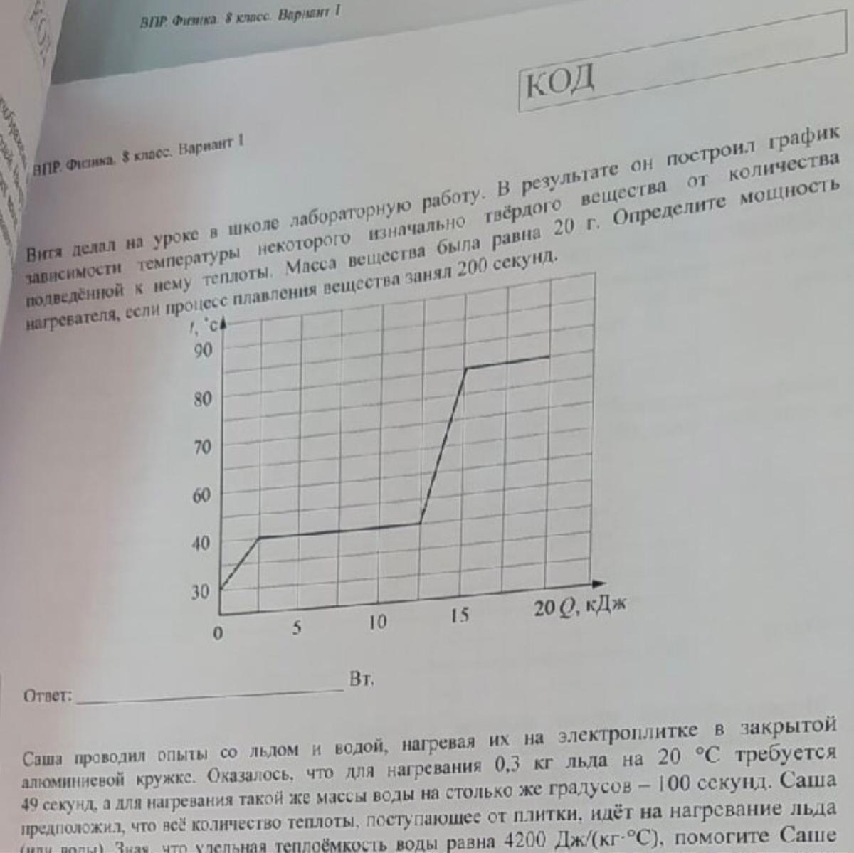 подведённой к нему теплоты. Масса вещества была равна 20г. Определите мощность нагревателя, если процесс плавления вещества занял 200 сек