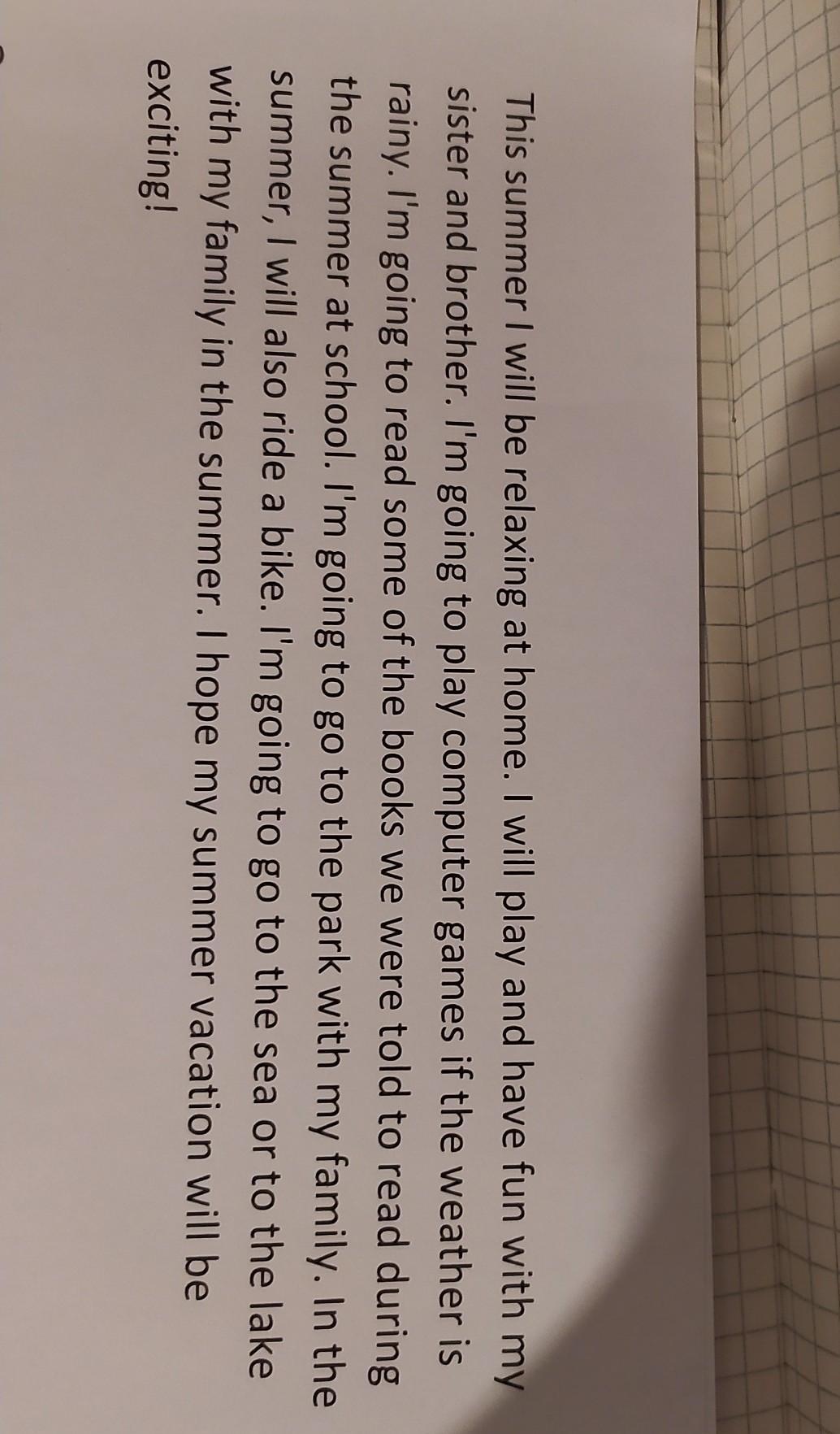Этим летом я буду отдыхать дома. Я буду играть и веселиться с сестрой и братом. Я собираюсь поиграть в компьютерные игры, если будет дождливая погода. Я собираюсь прочитать несколько книг, которые нам сказали читать летом в школе. Я собираюсь пойти в парк с семьей. Летом тоже буду кататься на байке. Летом поеду с семьей на море или на озеро. Надеюсь, мои летние каникулы будут захватывающими!