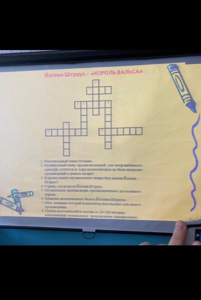 1. Полька. 2. Опера. 3. Вальс. 4. Австрия. 5. Марш. 6. Золушка. 7. Дунай. 8. Оркестр.