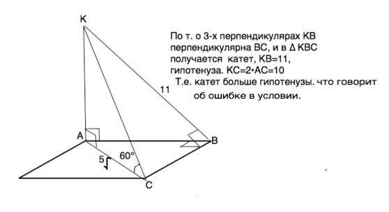 По т. о 3-х перпендикулярах КВ перпендикулярна ВС, и ∆ КВС прямоугольный с прямым углом КВС.В треугольнике КАС гипотенуза КС=АС:cos 60°=10