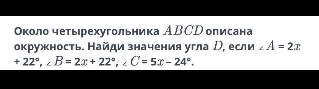 около четырех угольника ABCD описана окружность. Найди значение угла D если <А=2х+22°, <В= 2х+22°, <С= 5х+22°